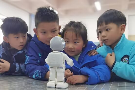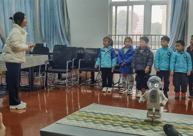 大班的流动幼儿则在学生服务团队的指导下开展了一节新颖有趣的教育机器人互动体验课。孩子们在老师的引导下,能够与机器人大胆互动,向机器人提问题,和机器人唱歌、跳舞、读绘本等。不仅让幼儿感知体验教育机器人的多项智慧功能,还激发了对科学探索的兴趣。