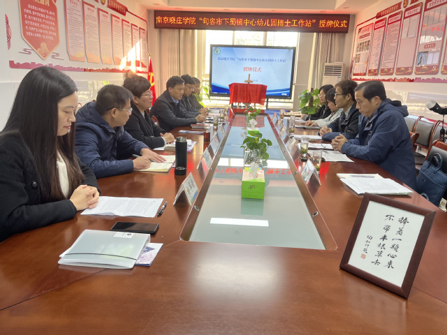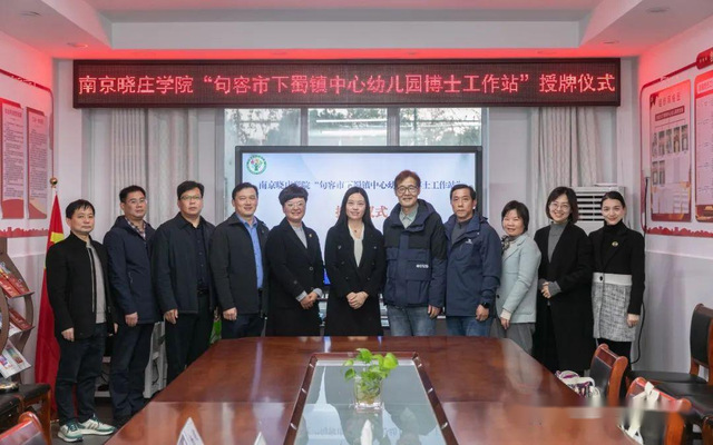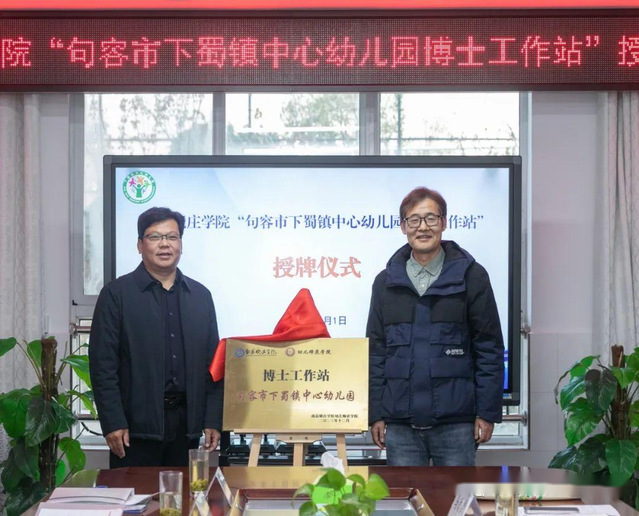 会议伊始,句容市下蜀镇党委副书记杨健致欢迎词。句容市下蜀镇中心幼儿园杨华俊园长介绍幼儿园基本情况:句容市下蜀镇中心幼儿园创办于1958年,先后创建为江苏省示范性实验幼儿园、江苏省平安校园等,该园秉承“构建儿童生态乐园,呵护生命和谐成长”的办园理念,积极构建自然生活课程体系,不断提升育人质量。今年由特级教师杨华俊园长主持的《奔跑天地间——乡村幼儿园自然生活教育的深度实践》荣获国家基础教育教学成果奖二等奖,成为乡村幼儿园建设发展的典范。随后,句容市教育局孔庆俊副局长介绍了句容市学前教育基本情况,必赢线路检测中心院长袁宗金教授介绍了学院学前教育专业发展建设情况,学院党委胡辰书记介绍了学院“党建搭台、校地共建‘博士工作站’助力乡村幼教振兴项目”建设发展情况,学院马洁然博士做表态发言。最后,袁宗金院长与孔庆俊副局长共同为“博士工作站”揭牌。